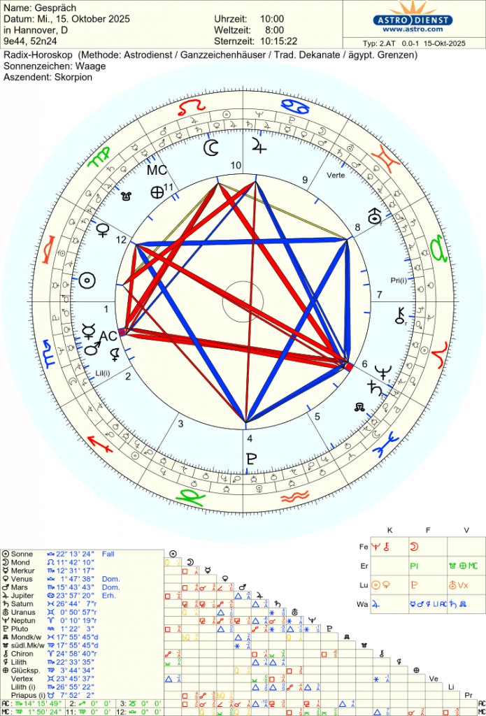 - Raum: Skorpion symbolisiert Intensität, Transformation und Macht; das 10. Haus steht für Beruf, öffentliche Rolle, Verantwortung. Die Position beschreibt, wo und wie die energiegeladenen, kämpferischen Kräfte wirken.